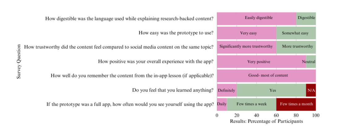 After the ten-minute interaction, participants filled out a written survey to reflect on their experience and provide personalized insight. Survey questions focused on the purpose of this study, asking about the ease of understanding language, trustworthiness of the app, content retention, and learning experience. The diagram to the left visualizes the results.
