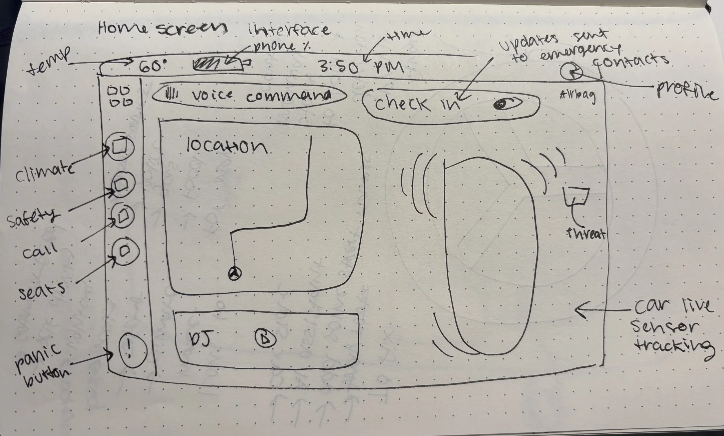 Although challenging to think about every feature that is included in a car interface, especially with an AI agent integration, I was able to visualize and include a panic mode, optimized gas routes and rest stops, internal and external sensor detection, and more.